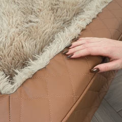 Premium Fabric Combo: Inner sleeping area crafted with long, plush fabric for warmth and softness, while the outer faux leather shell is sleek, durable, and scratch-resistant.
